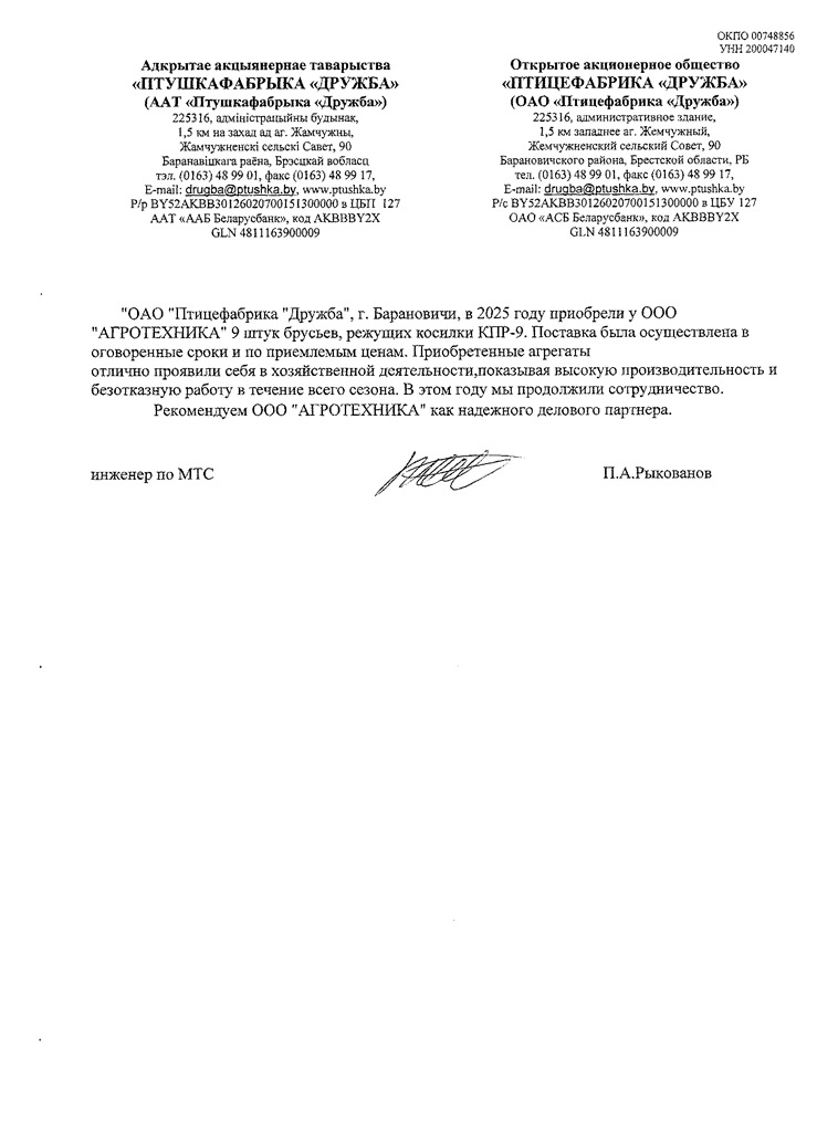 ОАО "Птицефабрика "Дружба", г.Барановичи, в 2025 году приобрела у ООО "Агротехника" 9 штук брусьев режущих косилки КПР-9. Поставка была осуществлена в оговоренные сроки и по приемлемым ценам. Приобретенные агрегаты отлично проявили себя в хозяйственной деятельности, показывая высокую производительность и безотказную работу в течение всего сезона. В этом году мы продолжили сотрудничество.